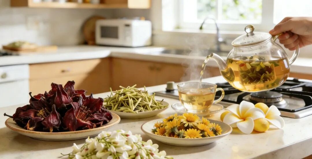 【材料】取木棉花10克、金银花5克、槐花10克、鸡蛋花10克、野菊花5克。