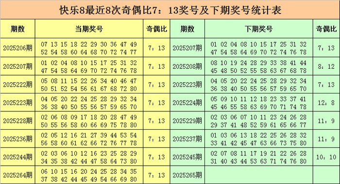 福彩快乐8第2025264期开奖回顾:06 10 15 16 20 24 25 28 34 35 37 38 42 44 45 49 54 66 69 80,其中奖号奇偶比为7:13,大小比为8:12,012路比为8:7:5。