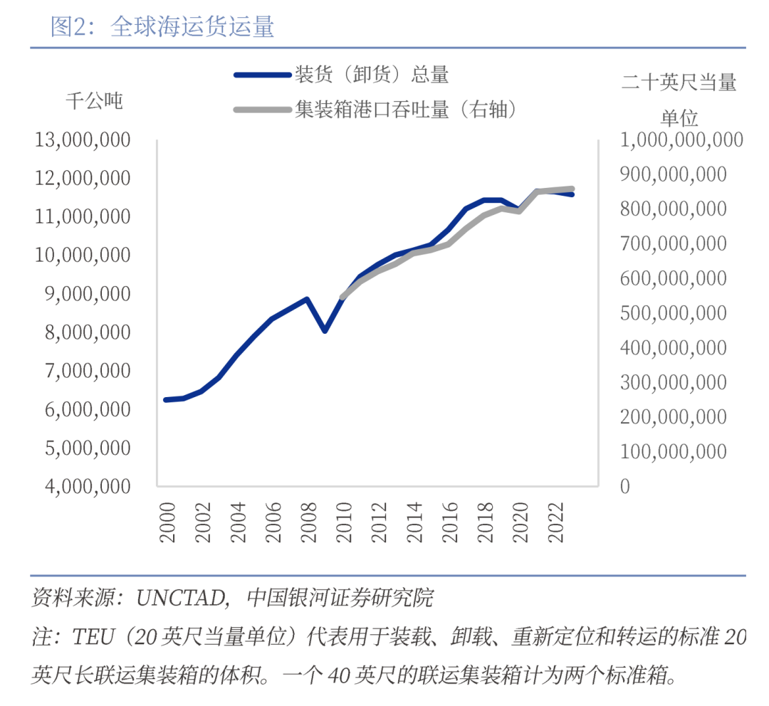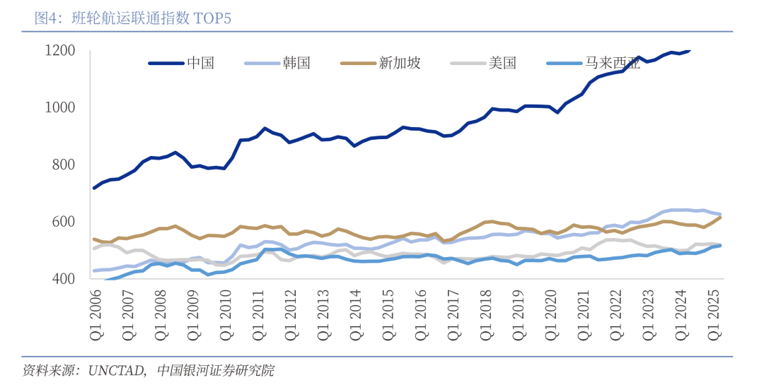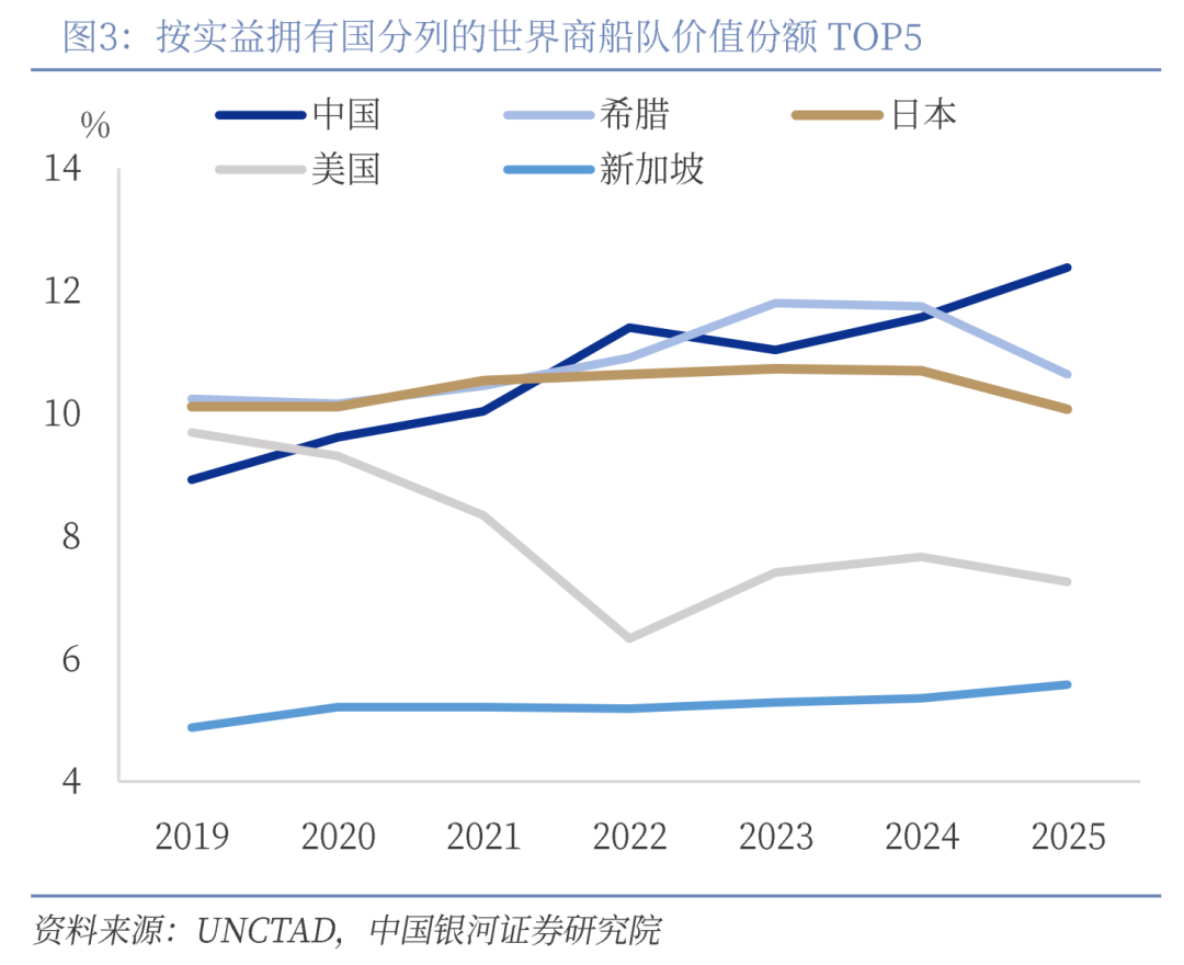 二是抢占通道:海洋通道是全球贸易与地缘战略的核心。海洋是最低成本、最高效的全球贸易通道,是全球经济的命脉。海洋为全球贸易提供了广阔的运输空间。海洋运输承载了全球80%的贸易量,是现代国际物流体系中不可或缺的核心环节。近年来,除金融危机、新冠疫情等冲击全球经贸运转的特殊时期外,全球海运货运量整体呈现明显上升趋势。历史上全球大国的蓬勃发展均在很大程度上依赖海上实力。目前,从按实益拥有国分配的世界商船队价值份额来看,我国2019年以占全球8.9%的水平位居全球第四,到2025年已经凭借12.4%的份额成为全球第一;从班轮航运联通指数来看,我国近20年来一直以绝对优势稳居全球第一的位次,且该指标近年来仍呈现明显上升趋势。