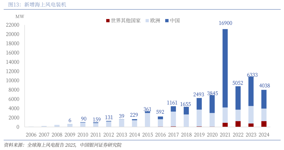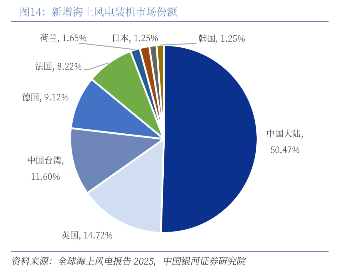 相较于陆上风光可利用空间有限的问题,海上风光因临近沿海用电集中区,能就近接入当地电网,还可有效破解土地资源紧张与电力消纳难题。我国拥有绵长海岸线与广阔近海海域,且海上风速、光照小时数均高于陆地,具备优异的开发潜力。2024年全国新增批准用海用岛项目数量、面积较上年分别增长70.0%和6.9%,为核电、石化及海上风电等重大项目提供了坚实的用海用岛保障。从新增海上风电装机来看,2017年以后,中国在全球的比重开始明显提升,2021年一度超过80%,此后虽然有所放缓,但无论是新增还是累积海上风电装机规模依然占据全球50%以上的份额。“十四五”期间,浙江、上海、广东等沿海省份已陆续出台海上风电相关政策并推进深远海项目,随着项目深入,深远海风电成本有望持续下降,海上光伏规模化发展也将加速,有望在“十五五”期间逐步形成价格竞争力。