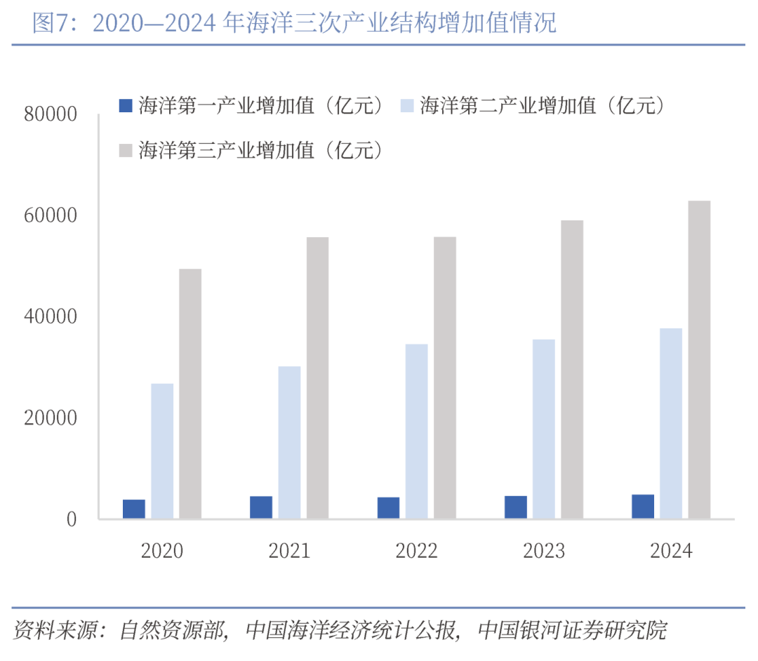海洋产业架构与规模优势:结构上,我国已形成海洋核心产业-科研与公共管理-上下游相关产业三层架构。规模上,2024年,我国海洋经济总量突破10万亿元,海洋船舶工业、海洋工程装备制造业国际市场份额领先,海洋服务业增加值约占海洋生产总值的60%,正在成为新的经济增长点。