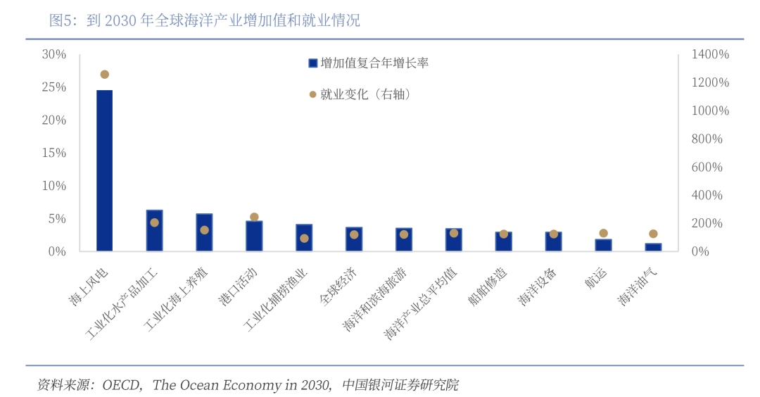 三是抢占市场:海洋经济规模不断提升,对经济发展的带动作用愈发强劲。整体来看,未来全球海洋经济市场潜力旺盛。据Polaris Market Research预测,2024年全球海洋经济市场规模为19,585.2亿美元。预计市场将从2025年的20,838.7亿美元增长到2034年的37,829.6亿美元,预测期内CAGR为6.8%。据OECD预测,从增加值复合年增长率和就业来看,全球海洋产业中增长潜力最强的领域主要是海洋风电。全球风能理事会的《全球海上风能报告》显示,截至2024年底,全球海上风电并网装机容量达83吉瓦,可为7300万户家庭提供低碳电力。据全球风能理事会预测,未来10年海上风电装机年复合增长率仍有望维持在21%左右,潜力不可小觑。到2034年末,全球将新增约350吉瓦海上风电装机,累计装机量有望达到441吉瓦。此外,工业化水产品加工、海水养殖、捕捞渔业等相对传统的领域未来五年内也会带来较大的增加值与就业的提升。