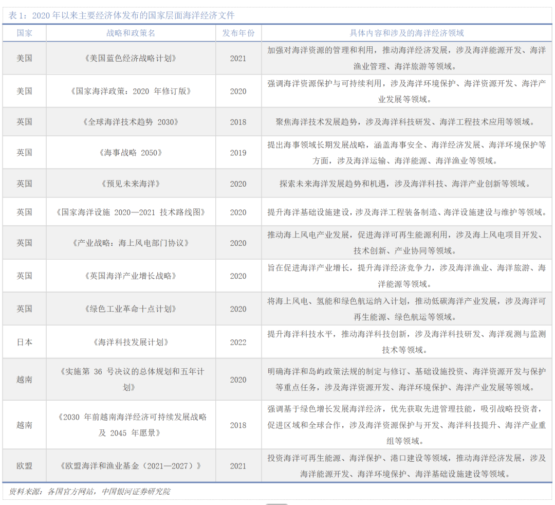 基于上述背景,全球主要经济体正密集出台海洋经济战略和规划,对重点领域发展予以大力支持,竞争态势明显。美国海洋经济规模庞大,涉及渔业、船舶制造、海洋油气开发、海洋旅游等多个领域。2022—2023年,美国海洋经济实际增长了2.9%,与美国整体经济增长水平相当。首先,美国在海洋交通运输、海洋旅游、海洋金融等产业领域具有较强的竞争力,不断通过政策支持和市场机制,推动海洋产业的升级和创新,进一步巩固其在全球海洋经济中的优势地位。其次,美国十分重视海洋科技的研发与应用,在海洋观测、海洋监测、海洋通信等技术领域保持领先,并将人工智能、大数据、物联网等新兴技术与海洋经济深度融合,提升海洋资源开发效率和海洋经济运行的智能化水平。此外,美国注重海洋能源资源的开发,推进海上风电、深海石油天然气等能源的勘探与开发,同时加强对海洋生态环境保护,以确保海洋经济的可持续发展。2024年6月,美国白宫环境质量委员会发布《美国可持续海洋经济战略》,通过保护海洋生态系统、增强社区适应能力和推动经济发展,构建可持续海洋经济体系。 除美国外,欧盟、日本、韩国等经济体也正在积极部署海洋经济体系。欧盟方面,欧盟致力于通过制定严格的环境保护法规和政策,推动海洋可再生能源、海洋生态旅游、可持续渔业等绿色海洋产业发展,减少海洋经济活动对海洋环境的负面影响。其中英国、德国、法国等国在海洋科研、海洋能源、海洋旅游等领域发展较为突出。日本作为岛国,海洋经济对日本至关重要。在船舶制造、海洋工程装备制造等传统优势产业基础上,加大对高端海洋技术的研发投入,如深海探测技术、海洋新能源开发技术等,提高海洋产业的技术水平和附加值。同时,日本积极布局海洋低碳经济,推动海上风电、海洋氢能源等可再生能源的开发和利用,减少对传统化石能源的依赖,实现海洋经济的绿色低碳转型。韩国在船舶制造、海洋工程装备制造等领域具有世界领先的技术水平,其造船产量占全球市场份额较高。此外,韩国还积极发展海洋新能源、海洋生物科技等新兴产业,推动海洋经济的多元化发展,加强海洋环境保护和可持续利用,努力提升其在全球海洋经济中的竞争力。