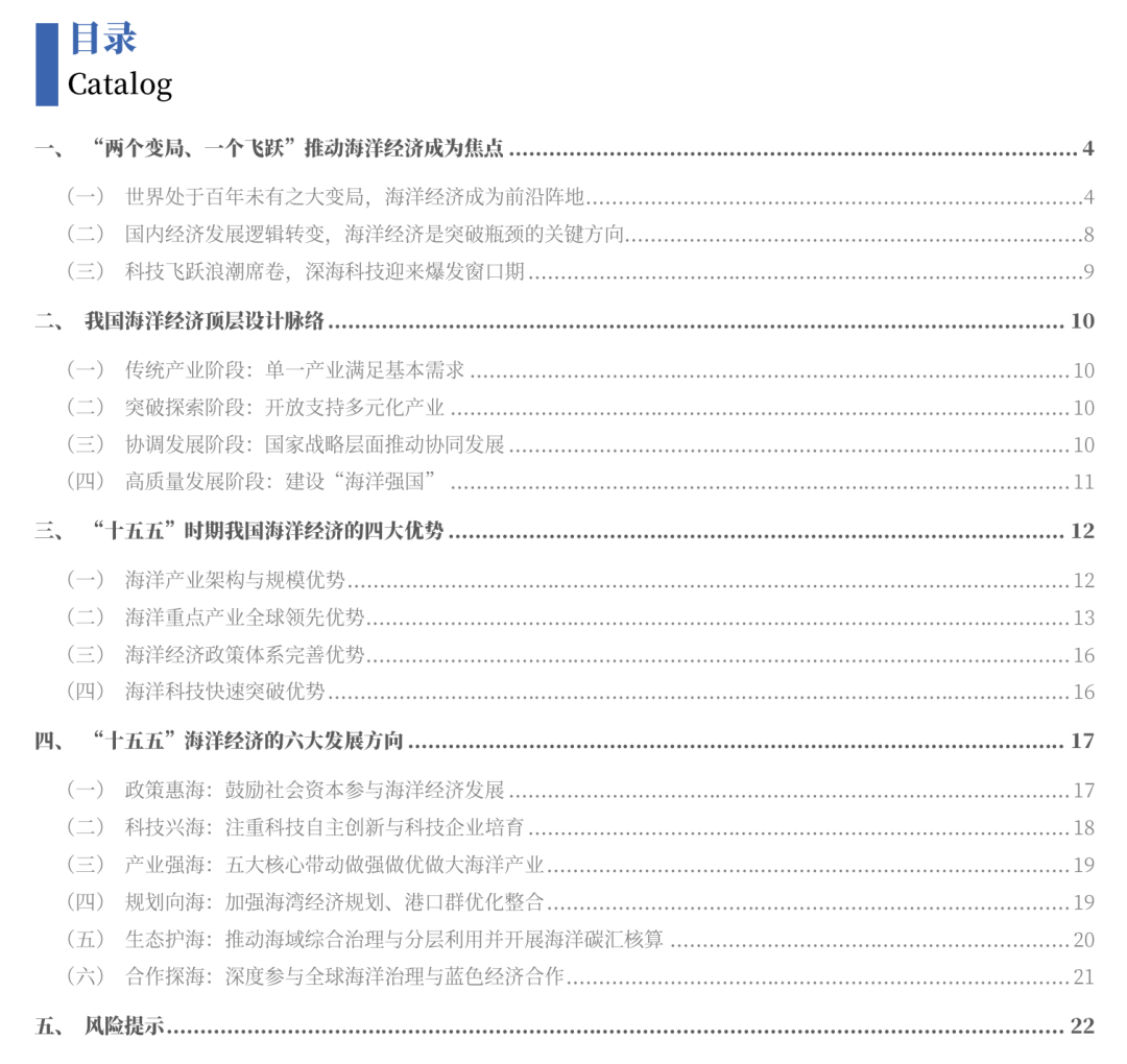 在上述背景下,我国“十五五”时期的海洋经济应当如何走向高质量发展?有哪些优势为未来高质量发展提供重要支撑?又有哪些短板和挑战需要重点克服?本篇报告将通过重点梳理我国海洋经济政策的发展脉络以及重点海洋经济领域的国内外发展趋势,基于当下的顶层设计的最新方向,给予详细解答。