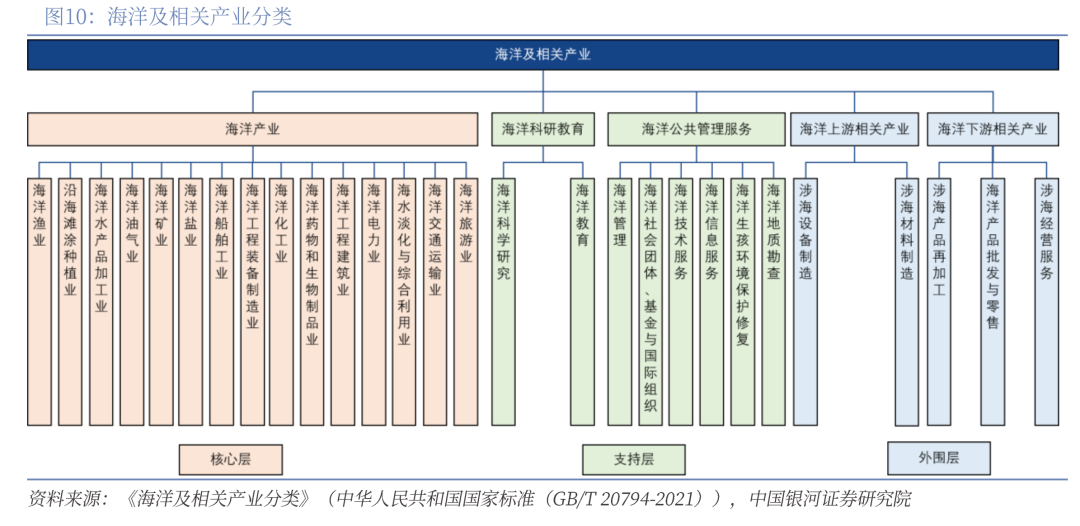 当前,我国海洋产业已经形成了相对齐全的体系化结构,呈现核心产业-科研与公共管理-上下游相关产业三层架构。根据《海洋及相关产业分类》(中华人民共和国国家标准(GB/T 20794-2021)),海洋经济是指开发、利用和保护海洋的各类产业活动,以及与之相关联活动的总和。海洋产业是开发、利用和保护海洋所进行的生产和服务活动,包括直接从海洋中获取产品的生产和服务活动;直接从海洋中获取产品的加工生产和服务活动;直接应用于海洋和海洋开发活动的产品生产和服务活动;利用海水或海洋空间作为生产过程的基本要素所进行的生产和服务活动。