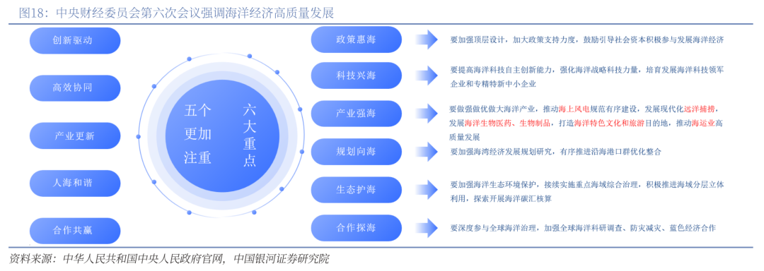 2025年7月1日,中央财经委员会第六次会议提出“推进中国式现代化必须推动海洋经济高质量发展,走出一条具有中国特色的向海图强之路”,将海洋经济置于中国式现代化的关键位置。会议提出五个“更加注重”原则引导推动海洋经济高质量发展,产业政策有望近期密集出台,即:“更加注重创新驱动,更加注重高效协同,更加注重产业更新,更加注重人海和谐,更加注重合作共赢”。该会议明确提出未来海洋经济发展的六大重点,为我国“十五五”时期海洋经济的高质量发展进行了系统部署。