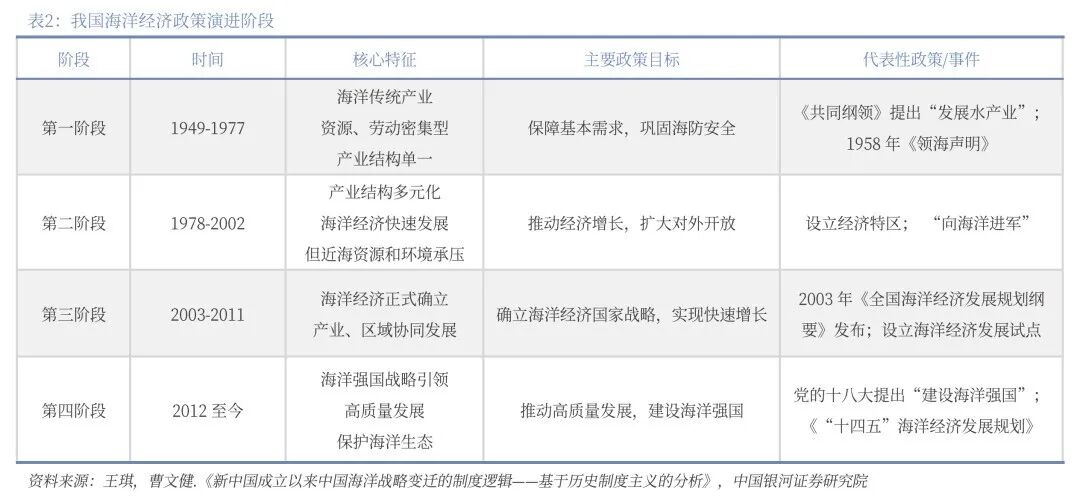 自新中国成立以来,我国海洋经济政策的演进,大致可以划分为四个主要阶段,每个阶段都呈现出不同的战略重点和政策特征。整体来看,体现出从单一产业发展到海洋经济综合发展,从经济优先到经济与生态并重,从封闭保守到开放发展,从发展海洋经济到建设海洋强国的清晰路径。