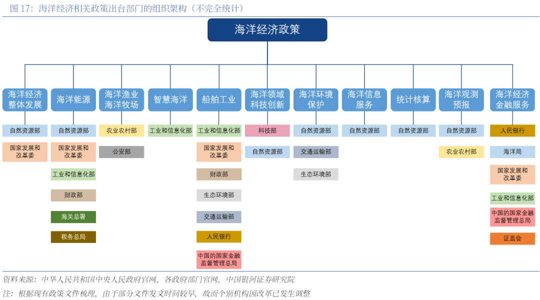 海洋经济政策体系完善优势:顶层设计上,从“十一五”起持续制定海洋经济五年规划。在此基础上,各部门围绕统计核算、观测预报、海洋能源、海洋渔业、船舶工业、海洋科技、海洋环境、海洋服务等领域制定政策;沿海省市制定区域性政策,形成“国家+部委+地方”联动的政策网络。