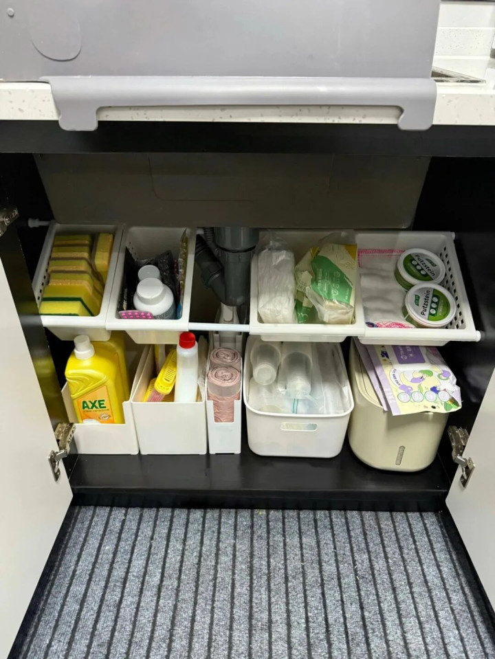 水槽下面利用伸缩杆+挂篮+直角收纳盒,上面一层放轻的,下面一层放重的,收纳厨房用品。