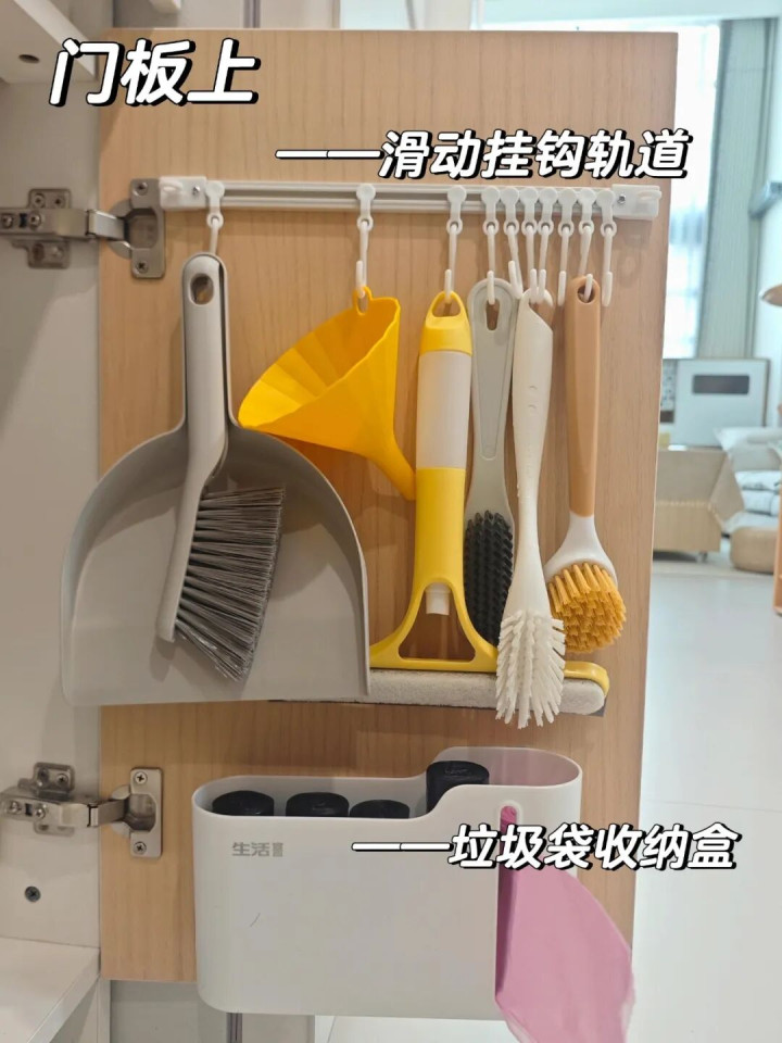 橱柜门板内固定一条挂钩轨道,用来挂一些清洁用具。