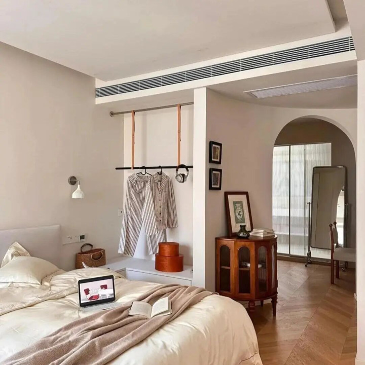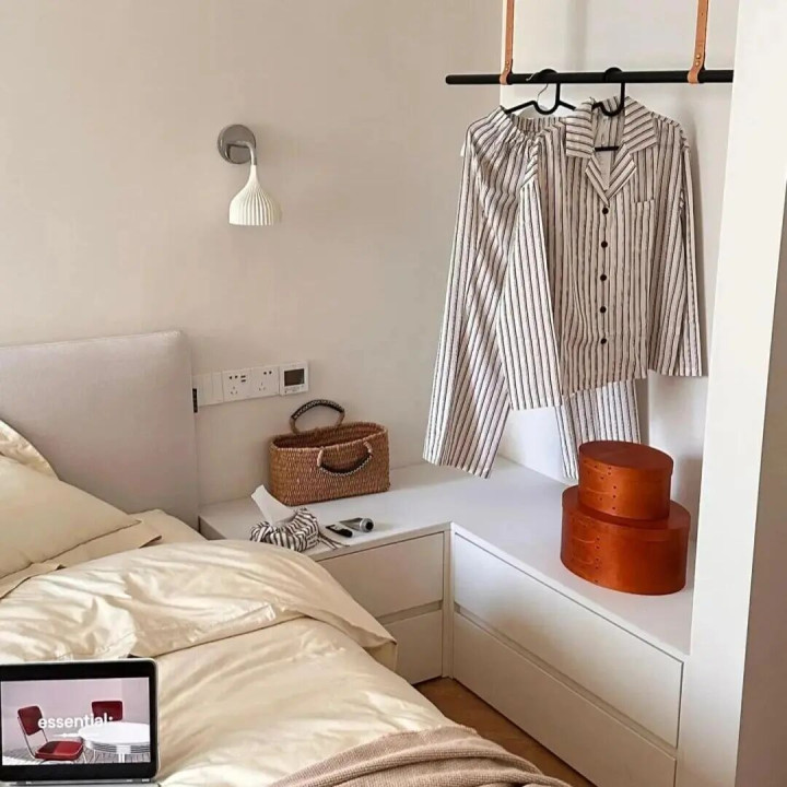 卧室小,放不下落地衣架,穿了一次又不想马上洗的次净衣,总堆在椅背上、飘窗上,不如把床头那点儿空间豁出去,改成次净衣区。