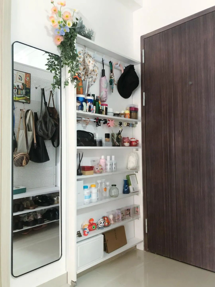 所有的化妆品、化妆工具、发饰、首饰以及杂七杂八的小东西都能收纳,还能挂雨伞、帽子、钥匙等,旁边贴个全身镜,简直不要太方便。